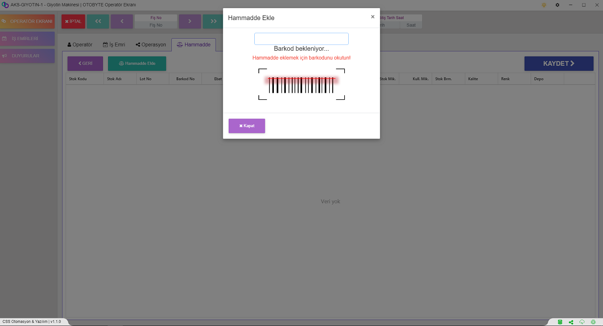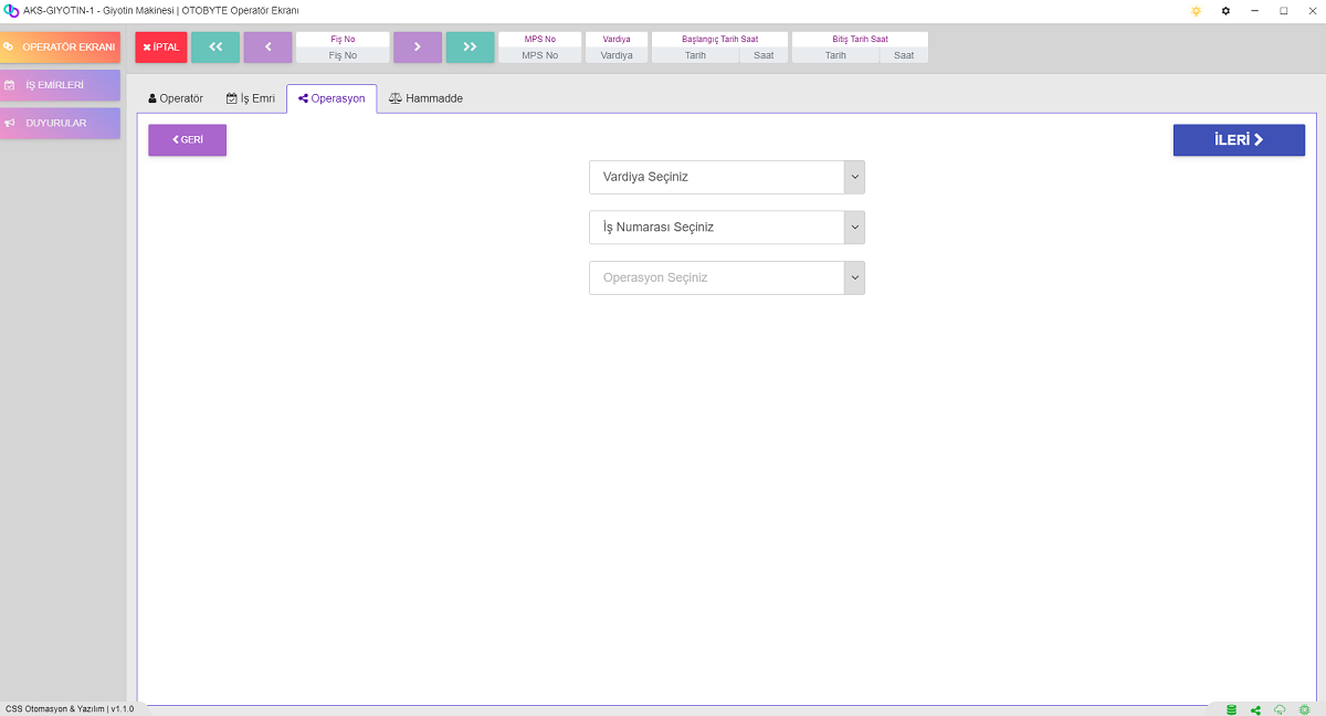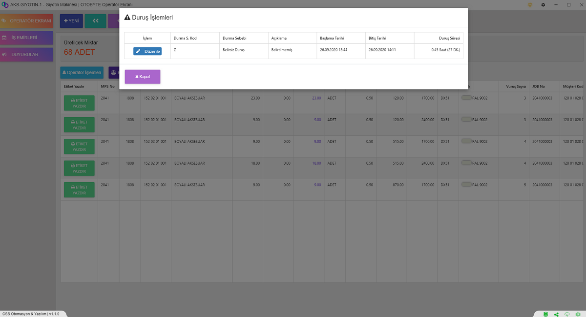 Makineyi ve Operatörün Performans Ölçümünde Çok Büyük Bir Yeri Olan Duruş İşlemleri; Makinenin Arıza Nedenli, Hammadde Eklemesi Yaparken ki Geçen Süre ya da Başka bir Sebepten Duruş Gerçekleştirdi ise Bunu Raporlamak ve Performansı Ölçmek Adına Duruş Nedenini Saatini Süresini Belirterek Bir Duruş Girmektedir.