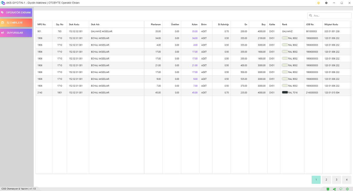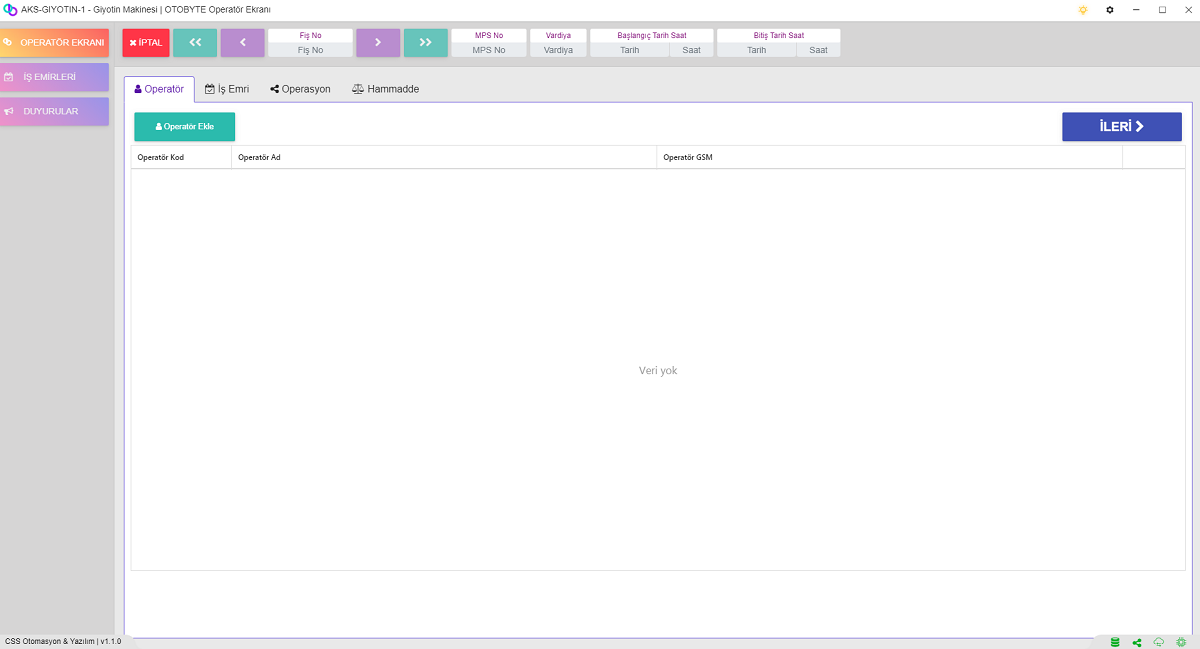 Makinelerin Çalışma Süreleri Duruş süreleri Sebepleri gibi Bütün Veriler Kayıt Altına alınıp Hem Geçmiş Olarak Görüntülenebilmekte Hemde Rapor Olarak Sunulmaktadır.Operatör Her İş Yaptığı Makineye İş Emrini Kendini Operatör Olarak Eklemek Zorundadır.Böylelikle Uygulama Tarih,Saat ve Süre Olarak Hangi Makinede Ne kadar Çalıştığını Takip Edebilmektedir. Ayrıca Girilen Duruşlar ile de Operatörün Performans Analizi ve Makinanın Performans Analizi Yapılabilmektedir.