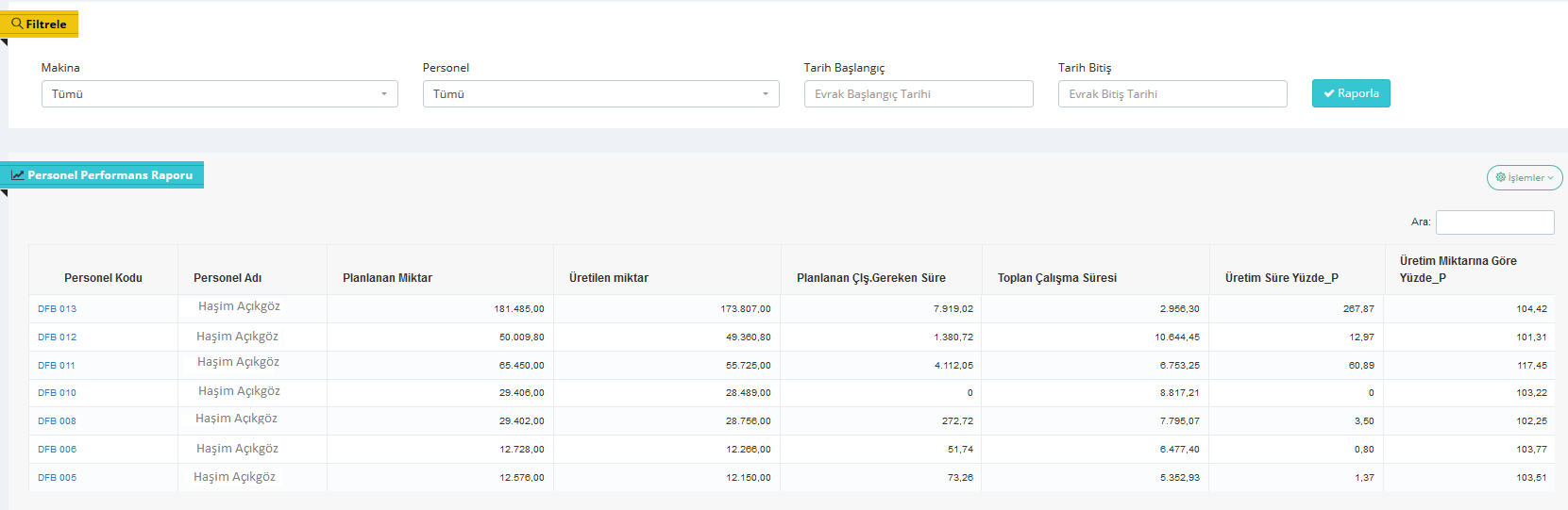 Böylelikle Hep Makineyi Hem Operatörü Kolaylıkla analiz Edebilmekteyiz.